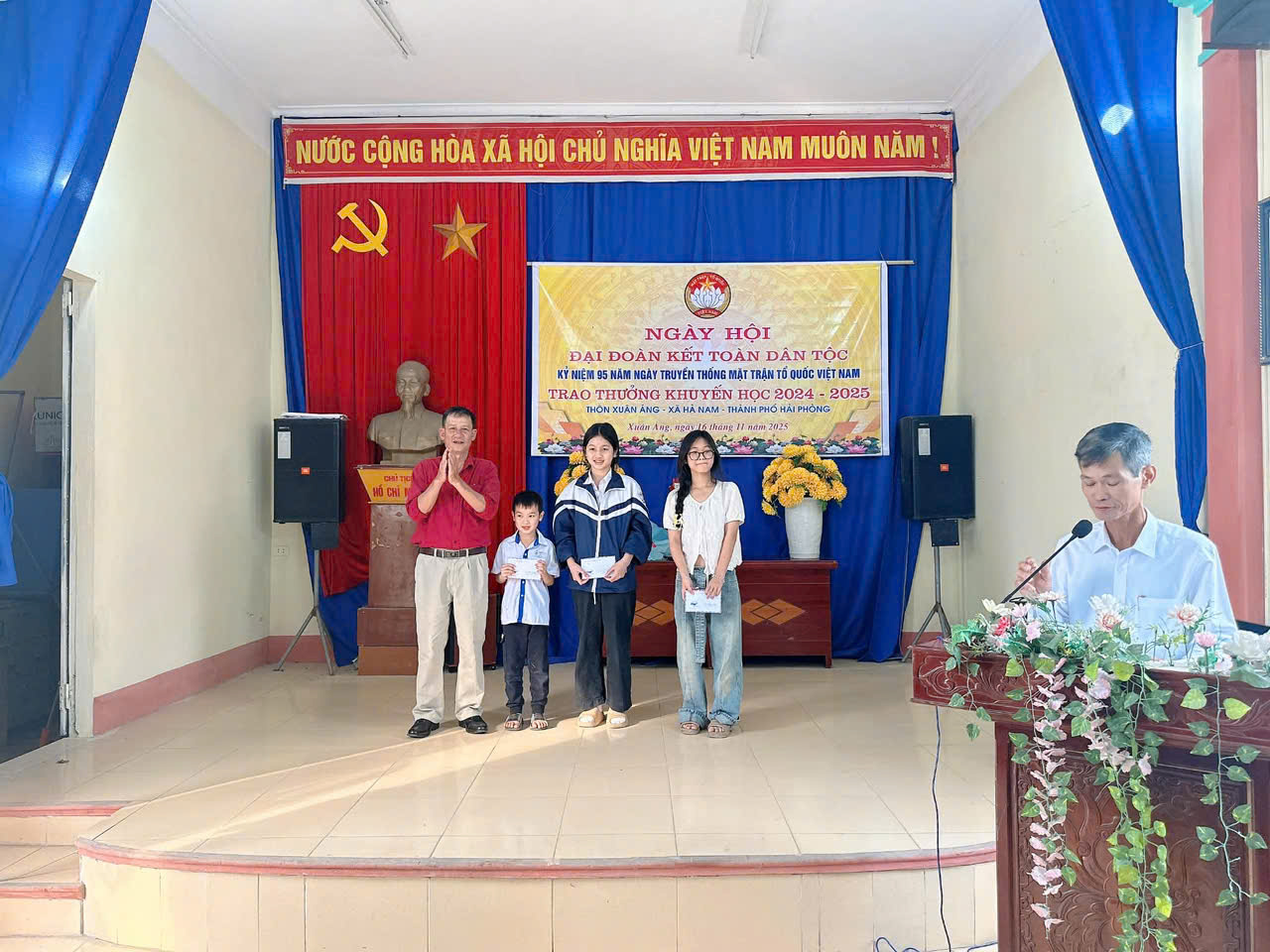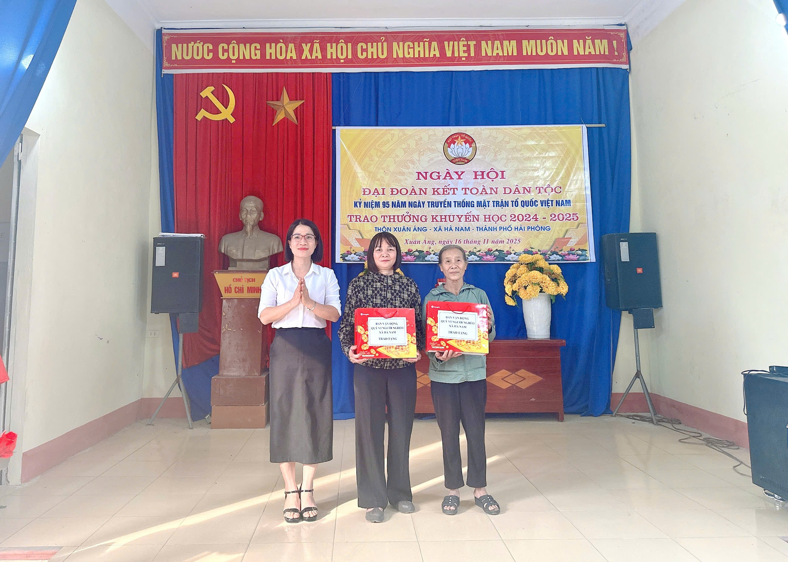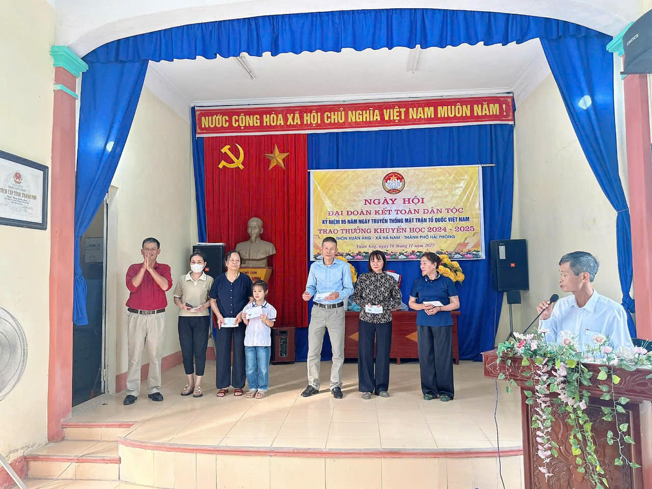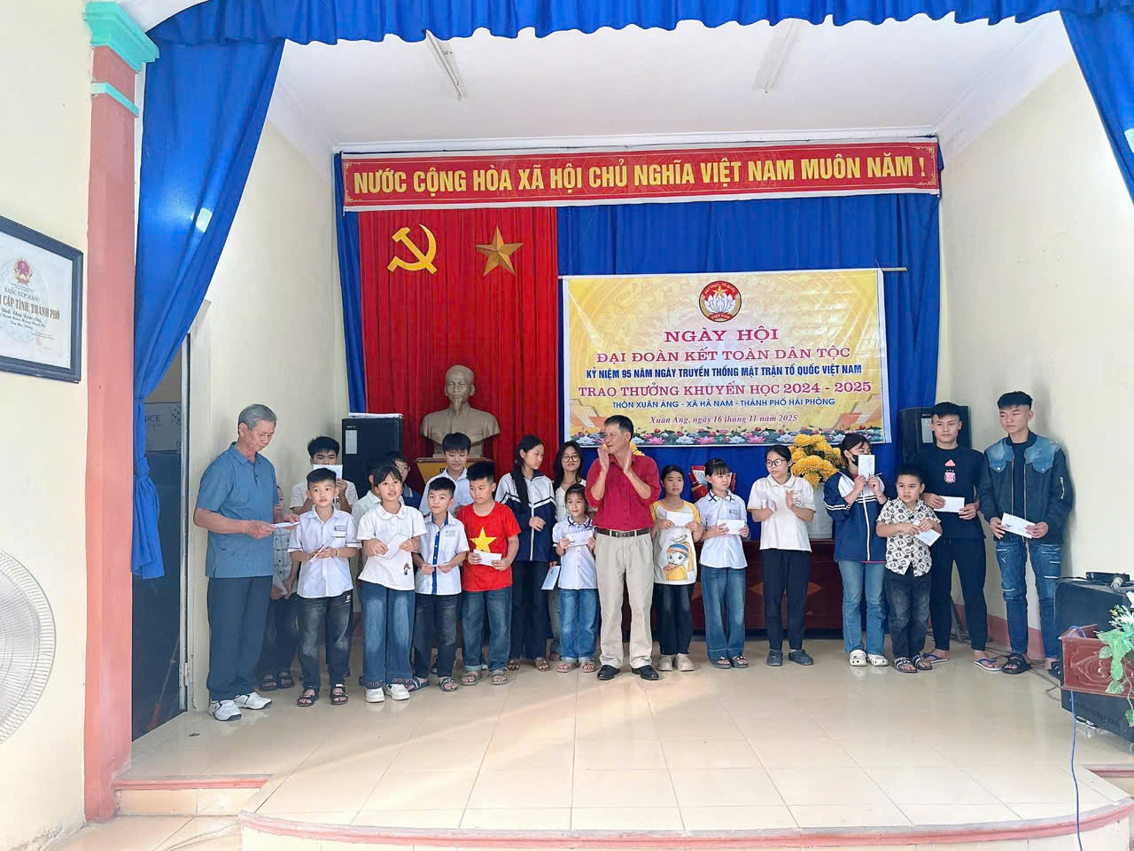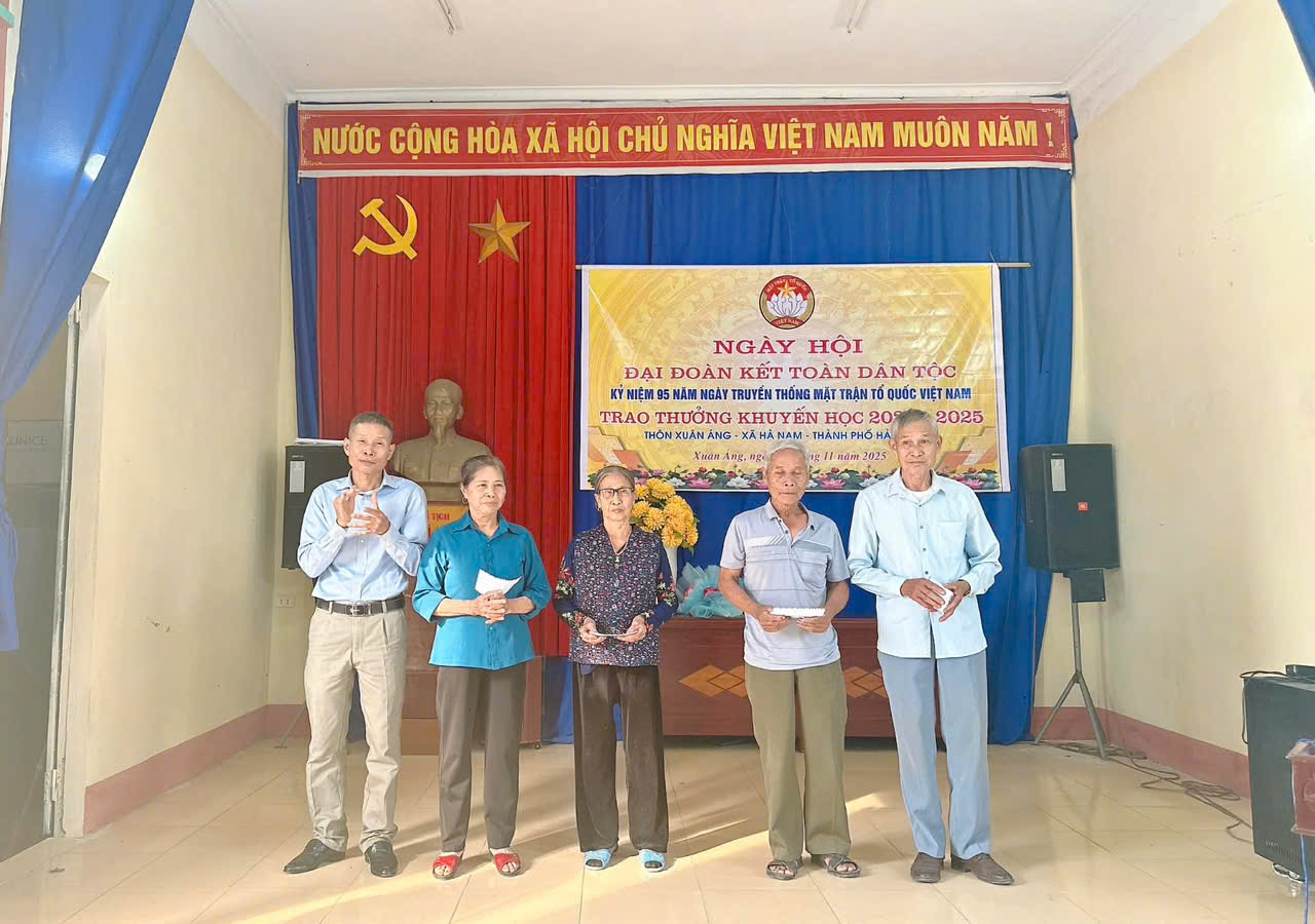 Trong đó, thôn Xuân Áng trích quỹ khuyến học trao thưởng cho 35 em học sinh đạt thành tích xuất sắc và thi đỗ vào các trường đại học trong năm học 2024–2025. Nhân dịp này, Xuân Áng đã vận động nguồn xã hội hoá tặng 18 suất quà cho hộ gia đình nghèo khó khăn ở thôn với tổng số tiền 9 trđ.