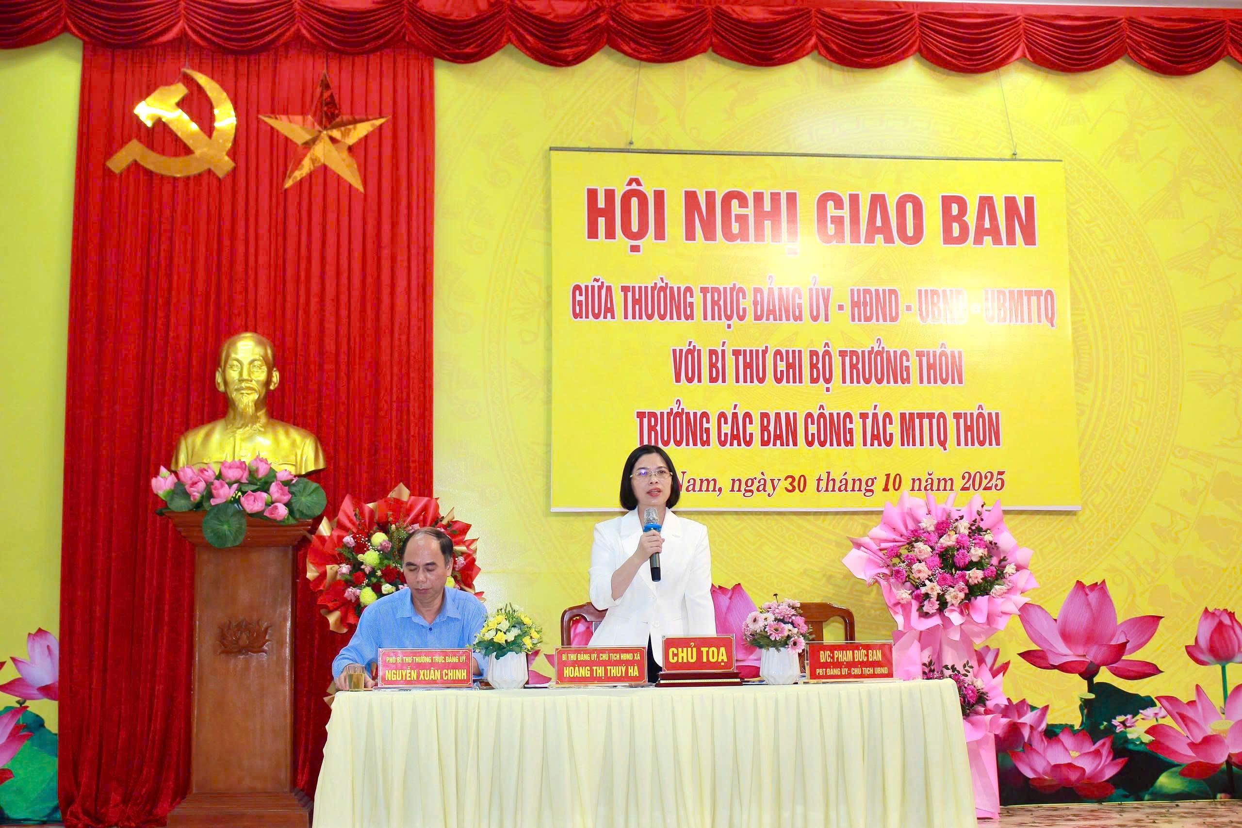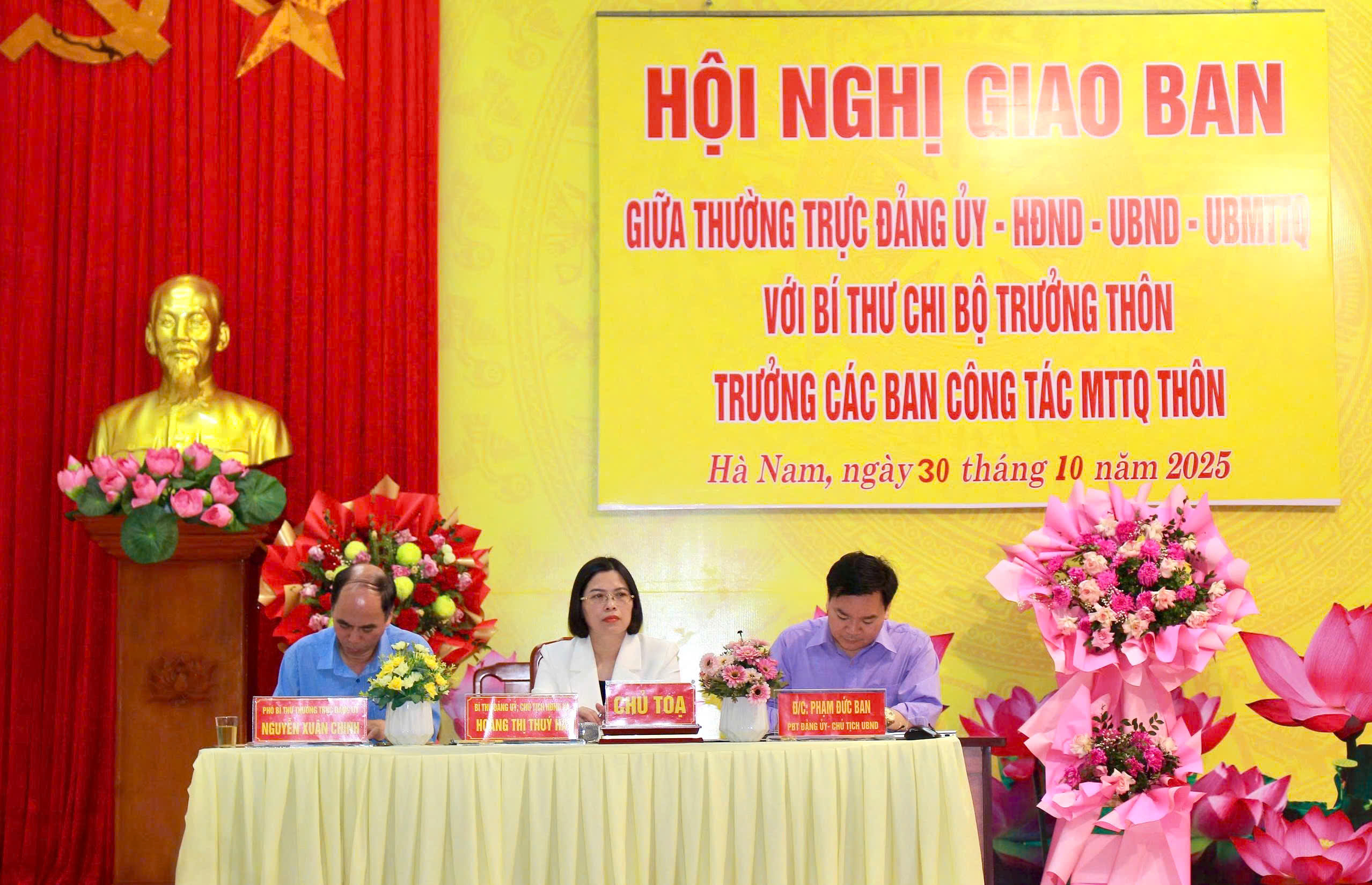 Sáng 30/10, tại Hội trường UBND xã Hà Nam, Ban Thường vụ Đảng ủy xã tổ chức hội nghị giao ban giữa Thường trực Đảng ủy - HĐND - UBND - Ủy ban MTTQ xã với đội ngũ Bí thư chi bộ, Trưởng thôn và Trưởng Ban công tác Mặt trận các thôn nhằm đánh giá kết quả lãnh đạo, chỉ đạo thực hiện nhiệm vụ chính trị tháng 10 và triển khai phương hướng, nhiệm vụ trọng tâm tháng 11 năm 2025. Đồng chí Hoàng Thị Thuý Hà- Bí thư Đảng uỷ- Chủ tịch HĐND xã chủ trì hội nghị.