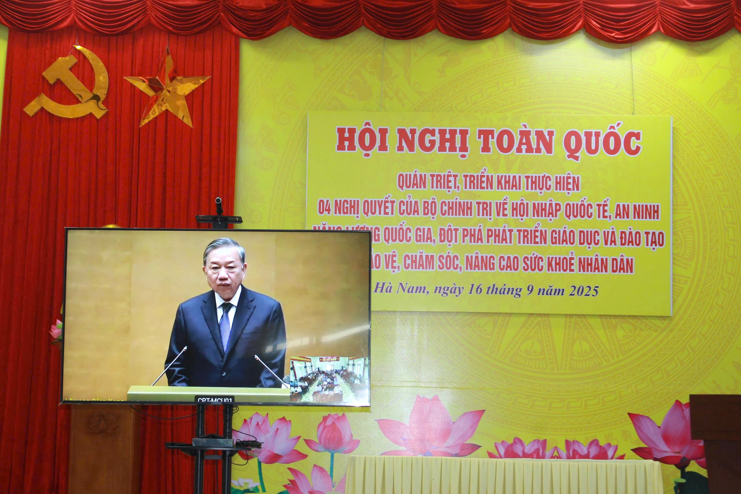 Hội nghị toàn quốc quán triệt và triển khai thực hiện Nghị quyết số 59-NQ/TW của Bộ Chính trị về hội nhập quốc tế trong tình hình mới, Nghị quyết số 70-NQ/TW của Bộ Chính trị về bảo đảm an ninh năng lượng quốc gia đến năm 2030, tầm nhìn đến năm 2045, Nghị quyết số 71-NQ/TW của Bộ Chính trị về đột phá phát triển giáo dục và đào tạo và Nghị quyết số 72-NQ/TW của Bộ Chính trị về một số giải pháp đột phá, tăng cường bảo vệ, chăm sóc và nâng cao sức khỏe Nhân dân được tổ chức vào sáng 16/9/2025.