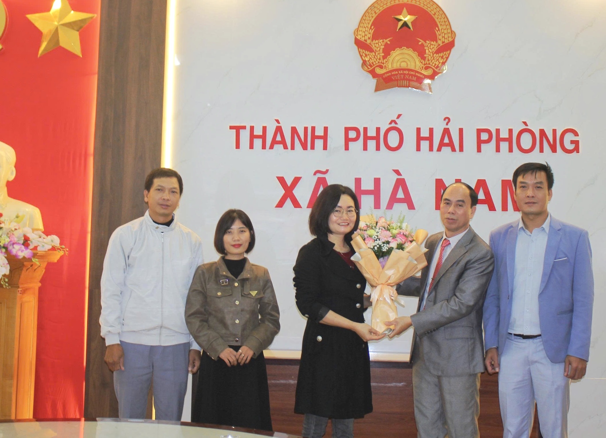 Đồng chí Nguyễn Xuân Chinh – Phó Bí thư Thường trực Đảng uỷ tặng hoa chúc mừng cán bộ, viên chức Trung tâm Dịch vụ sự nghiệp công xã Hà Nam